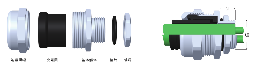 ☆ 產品特性 : 利用旋緊迫緊螺帽讓D部分夾緊圈收縮,來固定波紋管,被廣泛運用于電氣連接設備上
